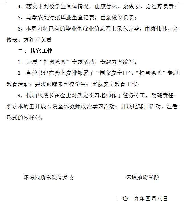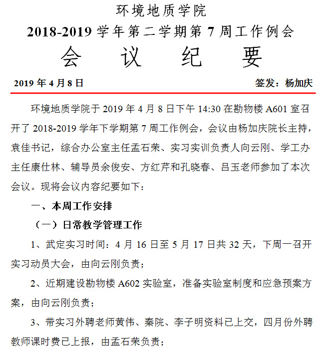 环境地质公司2018-2019学年第二学期第7周工作例会会议纪要