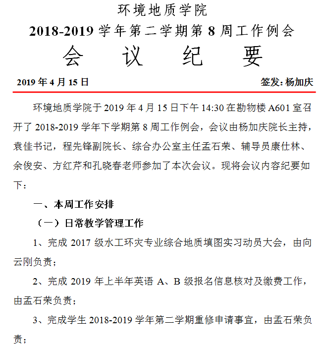 环境地质公司 2018-2019学年第二学期第8周工作例会