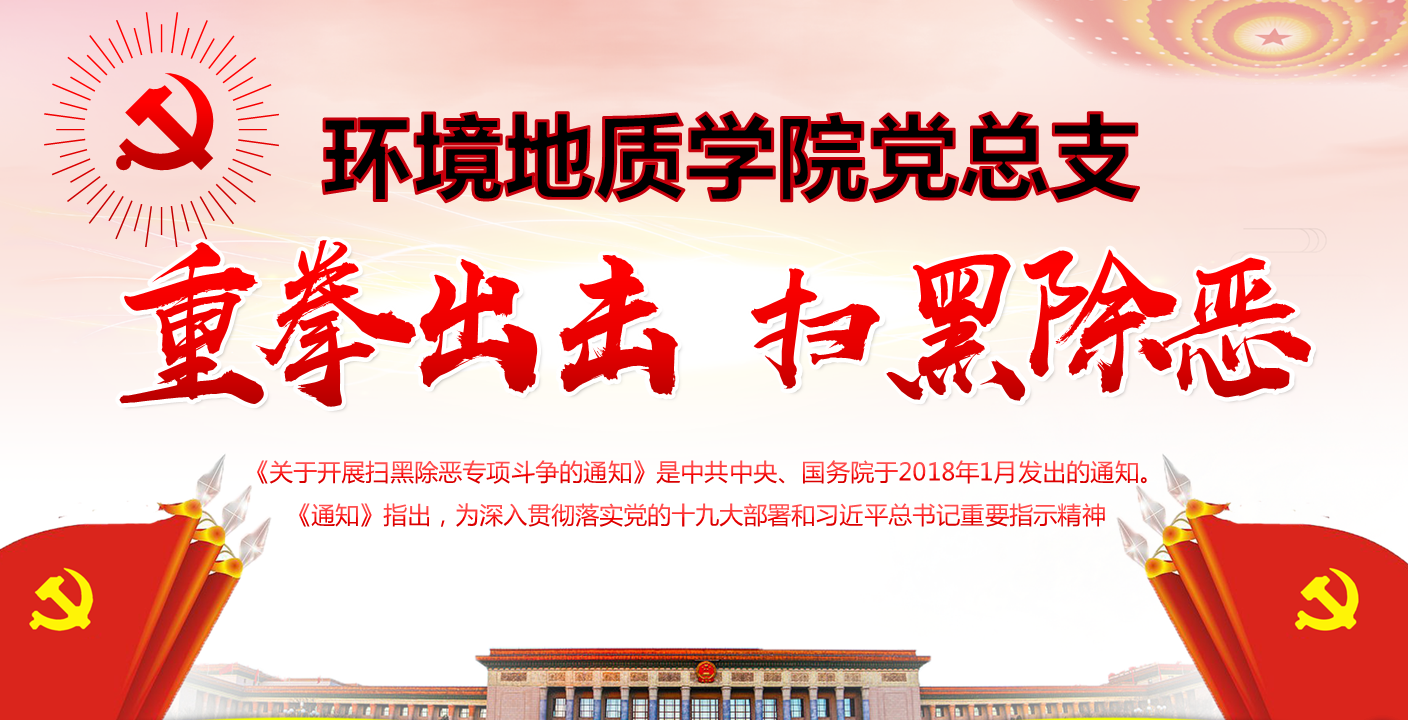 为认真贯彻落实党中央、国务院和省委、省政府关于扫黑除恶专项斗争工作的决策部署,发挥基层党组织政治优势、组织优势、直接联系服务群众优势,引导和鼓励党员群众和广大师生全面参与扫黑除恶专项斗争,按照省委组织部《在全省基层党组织和党员中开展“扫黑除恶—基层党组织在行动”活动周的通知》要求,环境地质世界杯官方网站入口2026党总支积极开展“扫黑除恶”系列学习宣传活动。