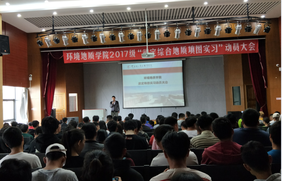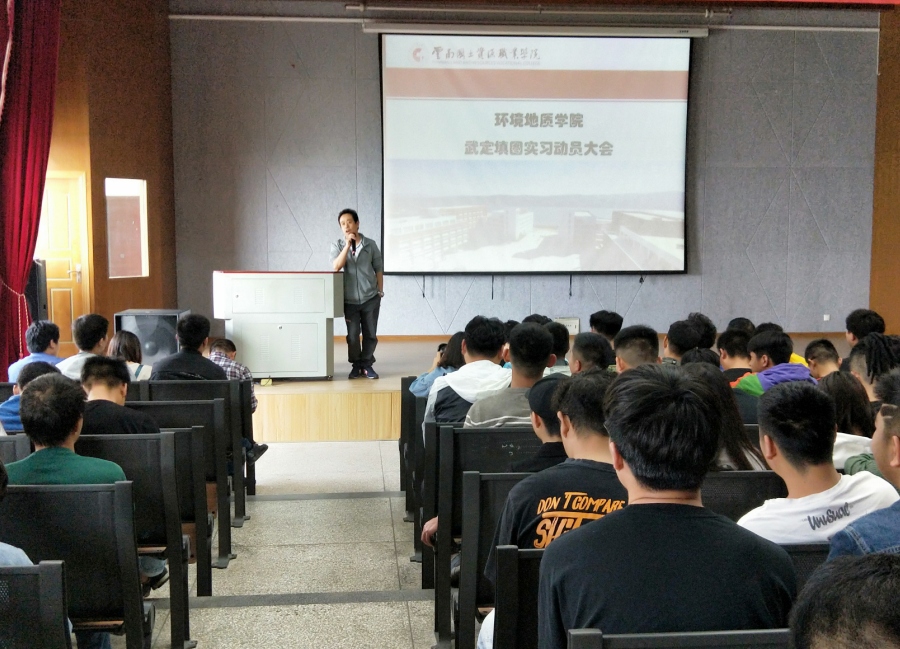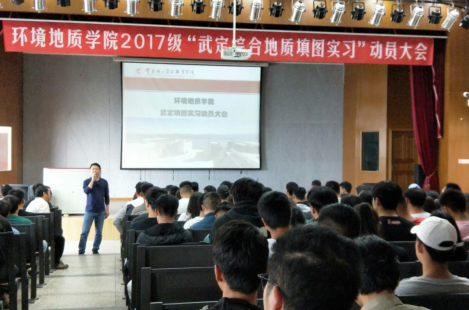2019年4月15日上午9点,环境地质公司在红山讲堂召开2017级员工赴武定校区综合地质填图实习动员大会,参会的领导老师有学安处副处长丁治祥、教务处朱波、公司经理杨加庆、世界杯官方网站入口2026党总支书记袁佳、公司副经理程先锋、公司实习实训办公室主任向云刚、公司综合办主任孟石荣、学工办主任康仕林、各实习指导老师、辅导员班主任及2017级工勘、地灾、水工、环地四专业全体同学。本次会议由公司副经理程先锋主持。