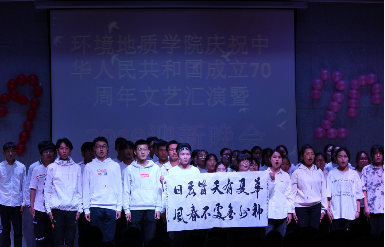 2019年11月27日18点,环境地质公司在红山讲堂组织庆祝中华人民共和国成立70周年暨2019级迎新文艺晚会活动。出席本次晚会的领导嘉宾有就业与校企合作处处长董云、创新创业处处长茹华所、就业与校企合作处副处长杨晓曦、就业科科长谭姝、本科公司团总支书记马佳、环境地质公司经理杨加庆、综合办主任孟石荣、学工办主任康仕林、实习实训办向云刚、团总支书记余俊安、全体2019级新生班主任、辅导员和2019级全体新生。