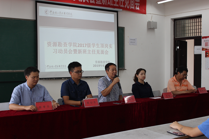 为进一步推进2017级员工顶岗实习工作,引导员工做好顶岗实习前的准备,公司于2019年6月20日12:40在勘物楼A503召开了“资源勘查公司2017级员工顶岗实习动员会暨新班主任见面会”。此次会议由资源勘查世界杯官方网站入口2026党总支副书记李倩老师主持,参加此次大会的老师有资源勘查公司经理左琼华教授、教务处实践教学管理科科长赵心亮老师、2017级班主任林家勇老师和郎学伟老师以及2017级钻探、物探、岩矿专业全体顶岗实习员工。