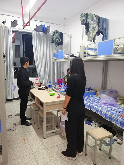 午后,老师们到绘锦苑走访了新生宿舍,亲切地与员工聊家常,嘘寒问暖,了解同学们的家庭情况,在军训中遇到的困难,询问大家到校后的感受及适应情况,提醒同学们要注意财产安全、人身安全,有问题及时向宿管和辅导员反映。还嘱咐同学们要注意寝室卫生,为后续的学习提供保障。