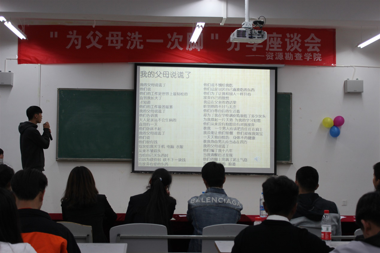 本次活动经过班级初选后共有18位同学进入到公司的决赛中分享他们在假期为父母洗脚的感受。比赛开始前参赛选手首先抽签并按顺序上台进行分享。第一次上台的同学难免会有点儿紧张,不过哪怕再紧张,声音再颤抖,也在自己的分享中表达出了那份对父母的感激与愧疚之情,讲到情深处,有的同学不自觉地流出了感动的泪水!18地调1班赵鹏同学亲手为父母写的一首诗《我的父母说慌了》道出了多年来父母为我们的默默付出。还记得当年那则为父母洗脚的公益广告,不知感动了多少人,那一首《常回家看看》不知牵动了多少人的心!