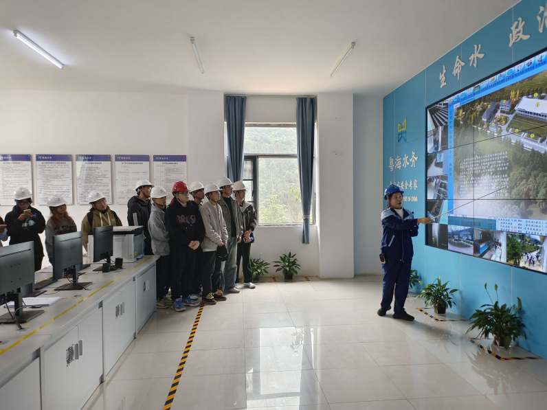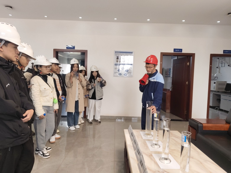 工作人员给同学们讲述了自来水水厂的建设历史、生产以及厂区的分布,梳理了自来水处理流程,带领同学们按照水处理工艺的顺序现场参观了配水井、沉淀池、加药间、送水泵房、调度室、水质监测站等工作现场,观察原水混合、絮凝、沉淀、过滤、消毒等工艺流程。在参观过程中,同学们不断提出自己的问题或想法,与工作人员进行互动和交流。